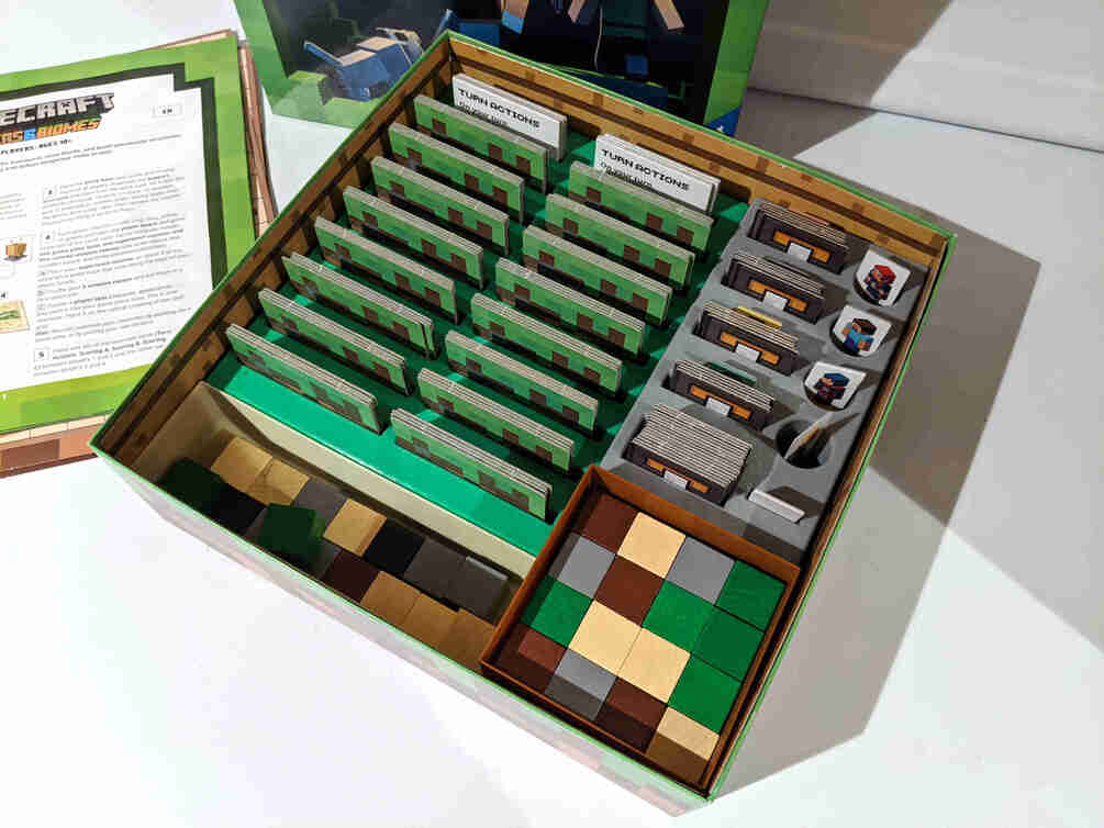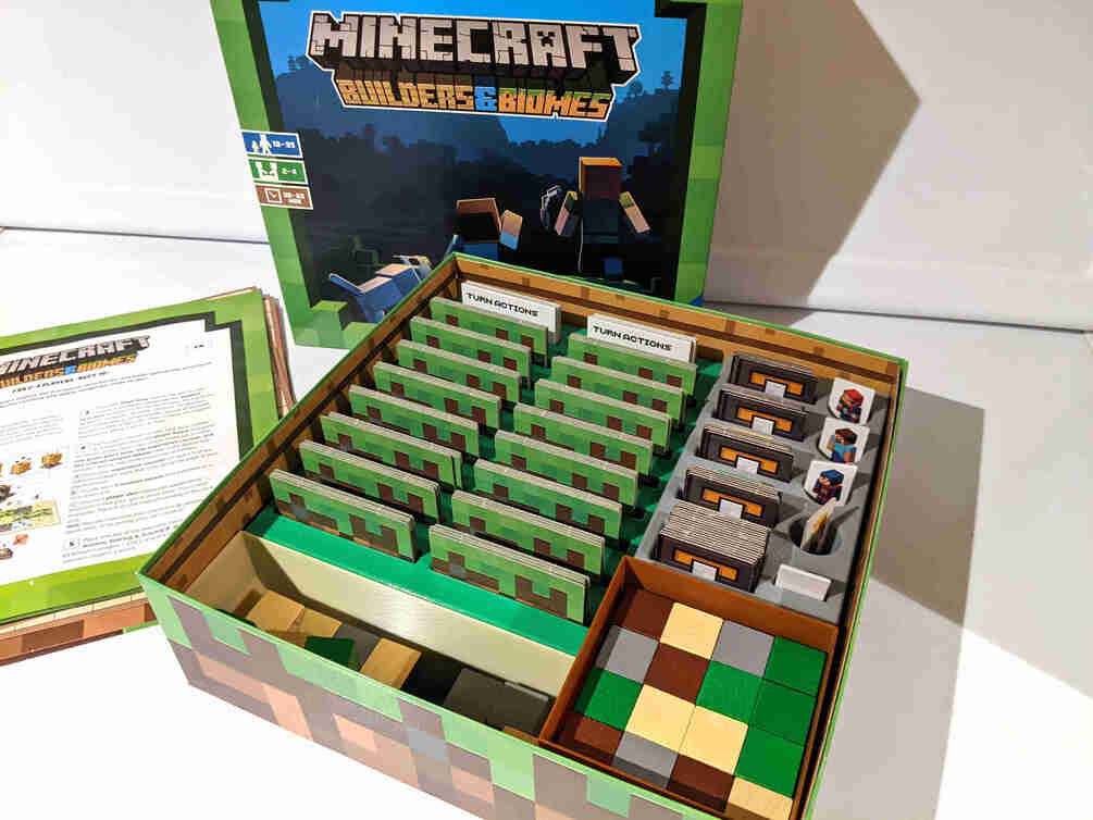 Organizational insert for the board game Minecraft: Builders & Biomes by Ravensburg. My kids and I really enjoy this game but setup can be a little time consuming. I created this insert to speed things up a bit.
